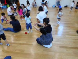 今回は玉入れ用の紅白玉を使って遊びました。最初はお家の人と一緒に紅白玉を落とさないように、『おでことおでこ』『おなかとおなか』『おしりとおしり』で挟んだり、キャッチボールをしました。また最後はボール送りゲームなどもして、体をおもいきり動かしました。