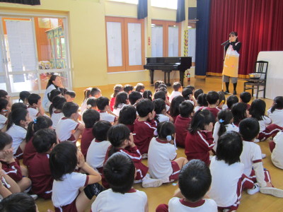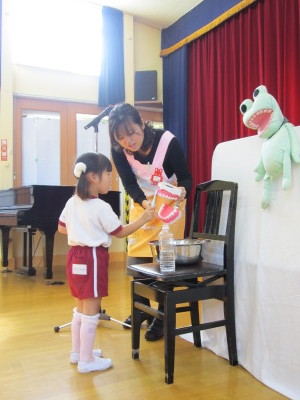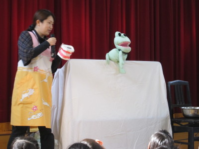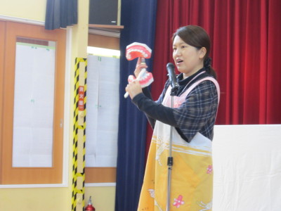 まずお遊戯室で人形劇や大きな歯の模型を見ながら、