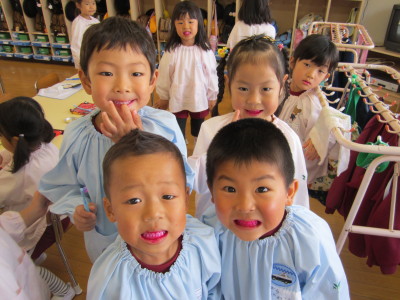ピンク色に染まった口を友だちと見せ合い「口紅がついてる!!」「ピンク色だよ!!!」