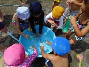 長い休みを挟んでの登園ということもあり、最初は少し照れくさそうにしていたお友だちも、水あそびが始まると、すぐにいつもの調子を取り戻し、お友だちや先生と笑顔いっぱいではしゃいでいました。
