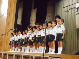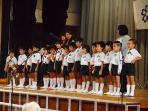 小学校の大きな体育館とたくさんのおじいちゃん・おばあちゃんの姿に少し緊張した様子も見られましたが、ピアノの伴奏が始まると堂々と歌う姿を披露し、お客様にたくさんの拍手をもらうことができました。