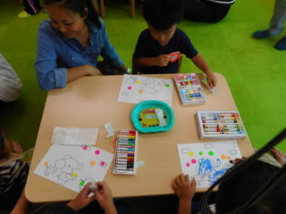 動物がシャボン玉を吹いているぬりえにクレヨンで色ぬりをし、丸シールを貼っていきました。