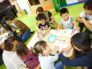 できあがった作品を最後みんなで見せ合いあっこしました。自分の作品を『できました♪』とみんなの前で発表すると、お友だちやお家の人からたくさんの拍手をもらい、子どもたちもとてもうれしそうな表情でした。