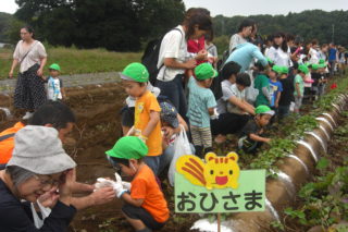 今日は、おひさまくらぶのお友だちみんなで草ぶえの丘に、親子お芋堀り遠足に行ってきました。初めて靴の上から履く、靴下ブーツに不思議そうにしている子もいましたが、畑までの道を歩き出すと足どりは軽く、表情もいきいきとしていました。