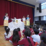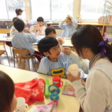 まずは、お遊戯室で人形劇や大きな歯の模型を見ながら、正しい歯ブラシの持ち方、そして歯の磨き方を
