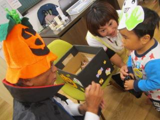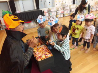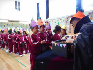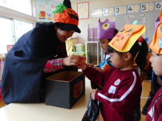 年少さんは、お友だちや先生と一緒に回り、元気いっぱい「トリック・オア・トリート」と言い、お菓子をもらいました。