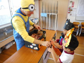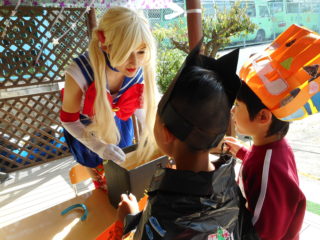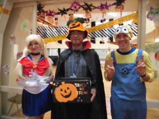 すてきな仮装をしている園長先生や英語の先生の所にお菓子をもらいに行きました。