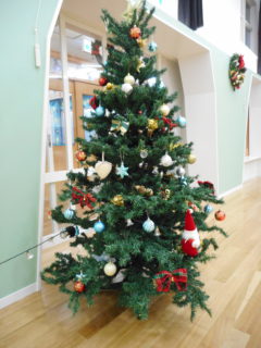 また、お遊戯室や玄関にもクリスマスツリーやリースを飾り、幼稚園の中も少しずつクリスマスの雰囲気になってきました。