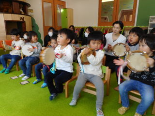 楽器あそびでは、子どもたちは初めて見る「タンバリン」に目を輝かせていました。最初は簡単なリズム打ちから、最後は曲に合わせて叩きました。