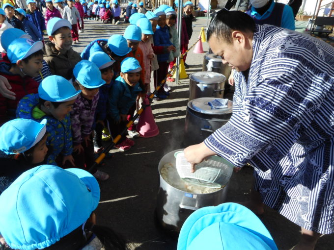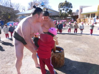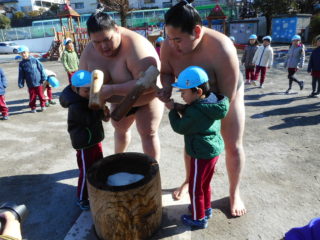 今日は子どもたちが楽しみにしていたおもちつきを行いました。今年は髙田川部屋の力士の皆さんをお迎えしてのおもちつきでした。