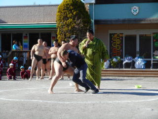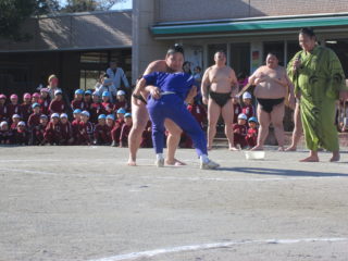 お相撲さん同士の迫力ある取り組みの後は、体操の先生や英語の先生の取り組みを見て、応援にも力がはいります。