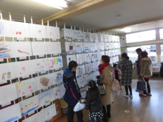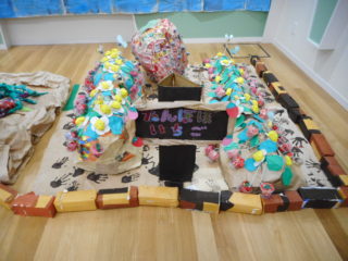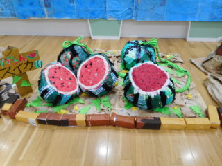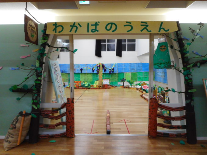 各クラス、絵の具だらけになりながら一生懸命作った作品がお遊戯室に集まり、素敵なわかば農園になりました。