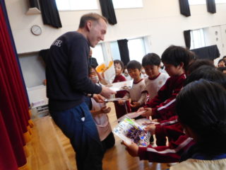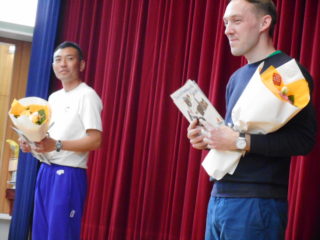 今日は子どもたちが日ごろお世話になった、体操と英語の先生が今年度で異動のため、子どもたちみんな揃ってお別れ会を行いました。