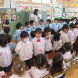 年少組さんは『お当番カード』の色塗りをしました。お当番活動ではどんなことをするのか先生からお話を聞き、期待を高めながら色塗りを楽しんでいました。