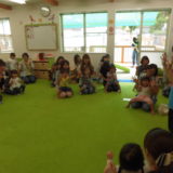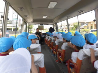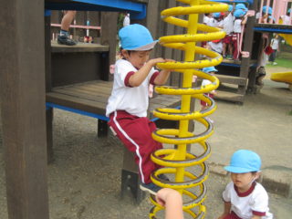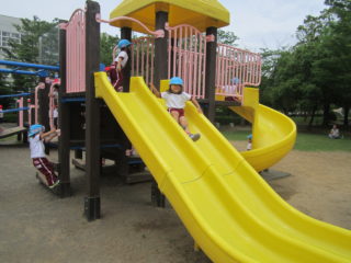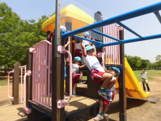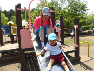 みんなでバスに乗って手遊びをしたり、クイズ大会をしたり楽しんでいるとあっという間に公園に着きました。「広ーい!」「すべり台たくさんあるね!」と大喜び。公園でのお約束を聞いて、いざ自由遊びスタート!!お友だちや先生と元気いっぱい駆け出しました。行ったことのあるお友だちもいたようで、好きな遊びをのびのびと楽しんでいました。