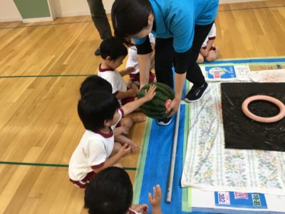 年少組さんにとって初めての保育参観。緊張しているお友だちや、いつもと違った雰囲気で泣いてしまうお友だちの姿も見られましたが、お家の人とゲームをしたり親子体操をしたりと、楽しく過ごすことができました。