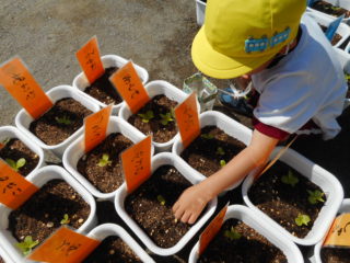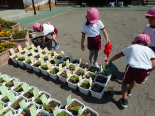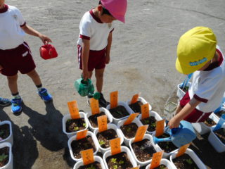 種の形に興味を示したり、毎日お水をあげながら芽が出たこと、花が咲いたことをうれしそうに話してくれました。また、お当番さんが責任を持って水をあげたり、お友達と「大きくなったね」と喜び合ったりして観察をしている姿もたくさん見られ、日々生長するのを楽しみに育てることができました。