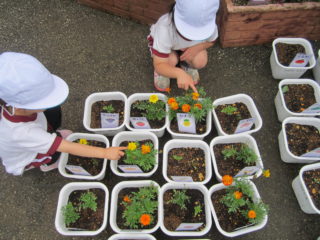 志津わかば幼稚園では、『植物に関心を持ち、大切に育てる』という目当てを持ち、一人一鉢栽培を行っています。年少組は「マリーゴールド」、年中組は「ホウセンカ」、年長組は「ミニヒマワリ」を育てました。