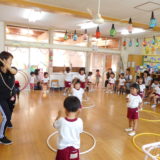 朝から「どんなお話かなぁ?」とドキドキワクワクしていた子どもたち。人形を見ると大喜びで、さるが出てくると怖がって泣いてしまった子もいましたが、さるをやっつける場面では「がんばれ!」「やっつけろ!」と一生懸命応援している姿があり、最後まで夢中になって物語を見ていました。