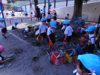 身支度を終えた子どもたちは、日影で砂遊びをしたり、虫探しなどをして楽しんでいました。