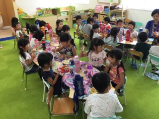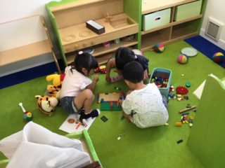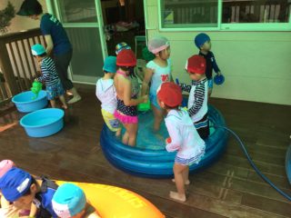 午前中はテラスに出て水遊びをしたり、午後からはおもちゃや、折り紙・ぬりえなどをして過ごしています。