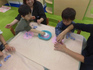 白い紙粘土に紫の絵の具を混ぜ込みました。粘土の柔らかい感触や、絵の具の感触に子どもたちも最初は少し戸惑った様子も見られましたが、慣れてくるとおもいきり手で感触を楽しんでいました。