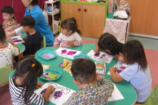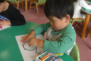 ハロウィンのコウモリのお面作りでは、コウモリに模様を描いて絵の具ではじき絵をしました。浮き出てくる模様に大喜びの子どもたちでした。