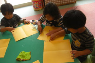 はさみで折り紙を一回切りしたものを貼り絵にして、お芋を作りました。お芋掘りに行った後だったので「ぼくのお芋は大きかったよ」「私のお芋は甘かったよ」などお芋の話をしながら楽しそうに作る姿が見られました。