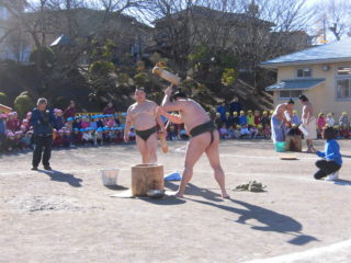 その後は各学年一人ひとり順番におすもうさんと一緒にお餅をつきました。