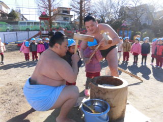 今日は、子どもたちがずっと楽しみにしていたおもちつきを行いました。今年も髙田川部屋の力士の皆さんをお迎えしてのおもちつきでした。