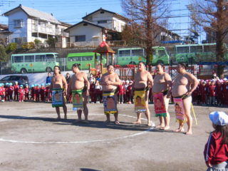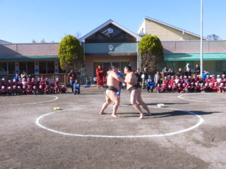 午後からはふれあい相撲大会を行いました。おすもうさん同士の迫力のある取り組みの後は、体操の先生や英語の先生の取組を見て、応援にも力が入ります。