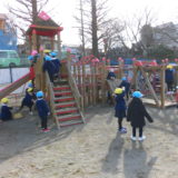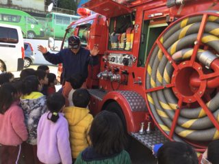 訓練後は、職員の消火訓練と年少組の消防車見学を行いました。近くから見る消防車は、迫力があり大喜びの子どもたちでした。消防士の方に詳しく説明していただき、どの子も興味津々でした。