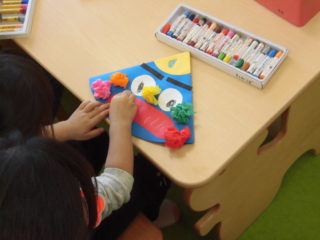 お面のパーツがたくさんで、糊付けも大変でしたが、お家の人と最後まで作り上げることができました。