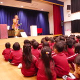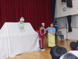 はじめに皆でお遊戯室に集まり、歯科衛生士さんによるお話を聞きました。