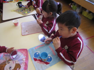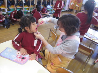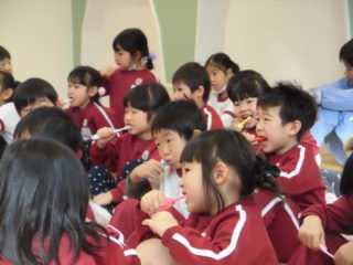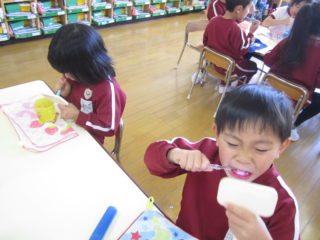 年中組は18日(金)に、年長組は22日(月)に歯磨き指導を行いました。