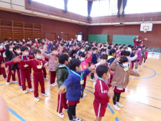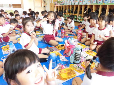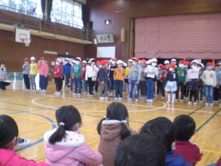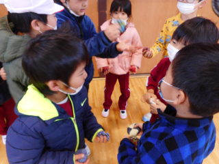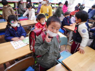 最後に一年生から折り紙のペンダントのプレゼントをもらい大満足でした。年長組からはお礼に「手のひらを太陽に」の歌のプレゼントをしました。帰りのバスでは「もっと遊びたかったな〜!」「一年生優しかった!」「早く一年生になりたい!」と言っており、入学への期待が高まったようでした。