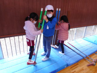 体育館では、けん玉、あやとり、こま、お手玉、かるた、おはじき、竹馬の7つの昔の遊びを教えてもらいました。優しく丁寧に教えてもらい、楽しく過ごすことができました。