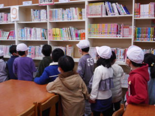 一年生に手を繋いでもらい、学校探検をしました。「ここは図書室だよ!」など優しく教えてもらいながら、たくさんの教室に目を輝かせていました。机にも座らせてもらい、大喜びでした。