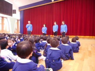 3学期はどんなことがあったのか振り返り、園長先生のお話では、今まで頑張ってきたことを褒めてもらい、子どもたちはとてもうれしそうでした。