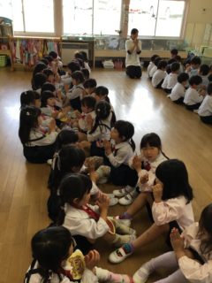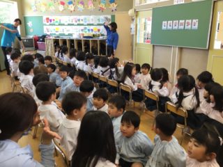 今日は、歓迎会を行いました。年長さんが年少、年中組のお部屋に遊びに来てくれ一緒に歌を歌たり、手遊びをしたりと楽しい時間を過ごしました。