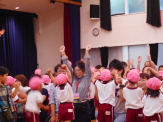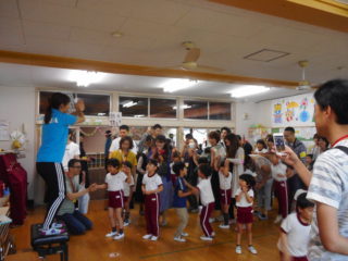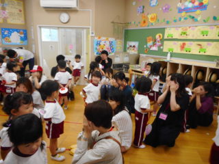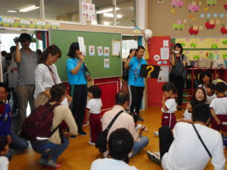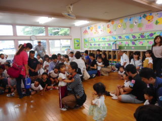 年少組さんは、初めての保育参観で、お家の人とふれあい遊びをしたり体操をしたり、楽しく過ごしました。